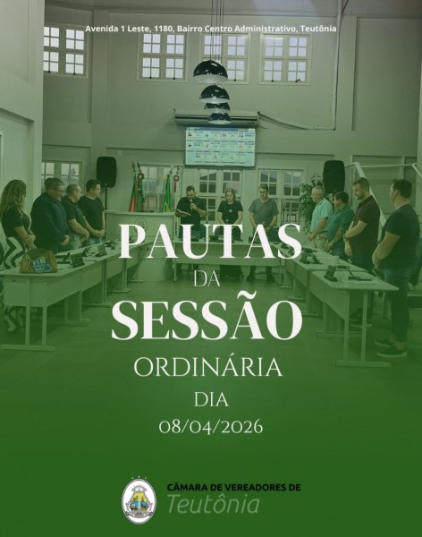 Câmara de Vereadores de Teutônia irá se reunir em Sessão Ordinária às 18h30, nas dependências da sede do Poder Legislativo, no dia 08 de abril de 2026, para apreciar as seguintes pautas protocoladas: