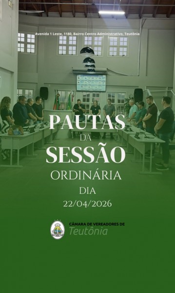 Câmara de Vereadores de Teutônia irá se reunir em Sessão Ordinária às 18h30, nas dependências da sede do Poder Legislativo, no dia 22 de abril de 2026, para apreciar as seguintes pautas protocoladas: